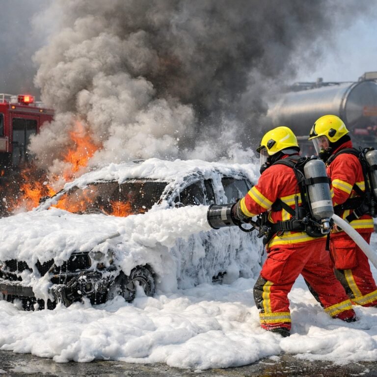 نمایی از عملیات اطفای حریق یک خودروی مشتعل با استفاده از کف آتشنشانی؛ فوم F3 با ایجاد لایهای از کف غلیظ روی آتش، از تماس اکسیژن با سوخت جلوگیری کرده و حرارت را جذب میکند. این پتوی کف باعث خاموش شدن سریع آتش و ممانعت از شعلهوری مجدد میشود.